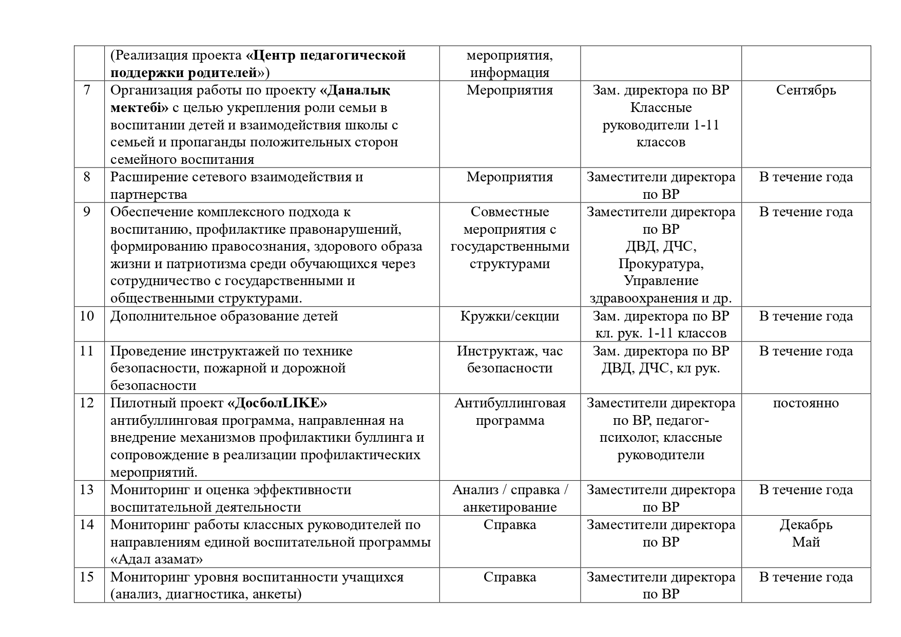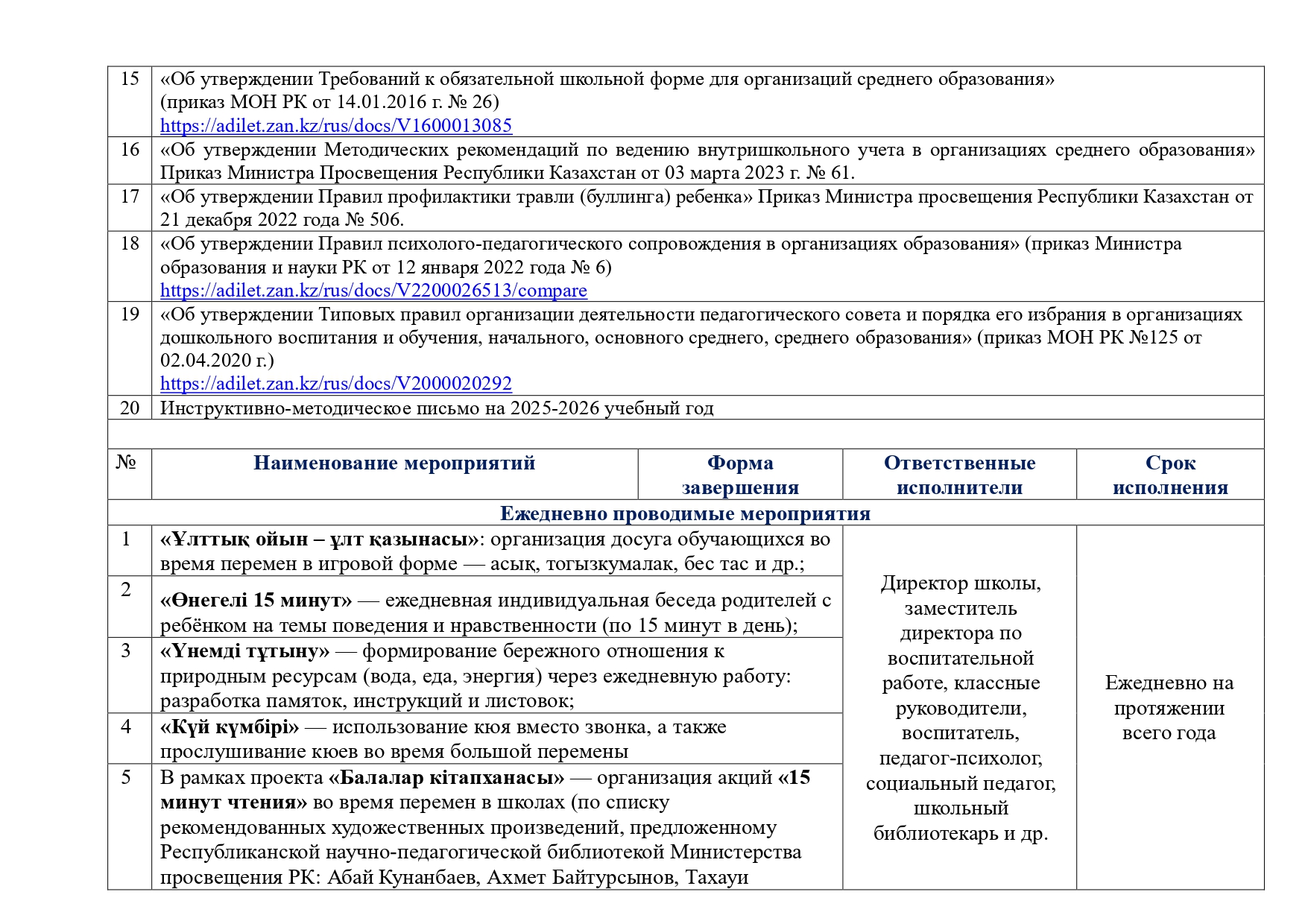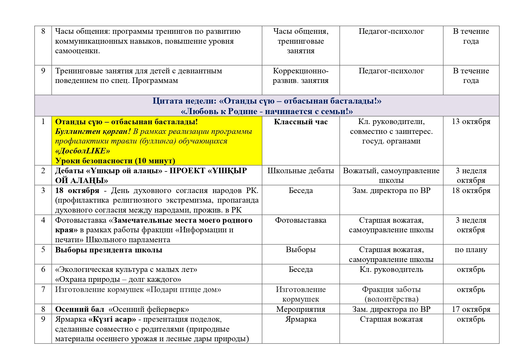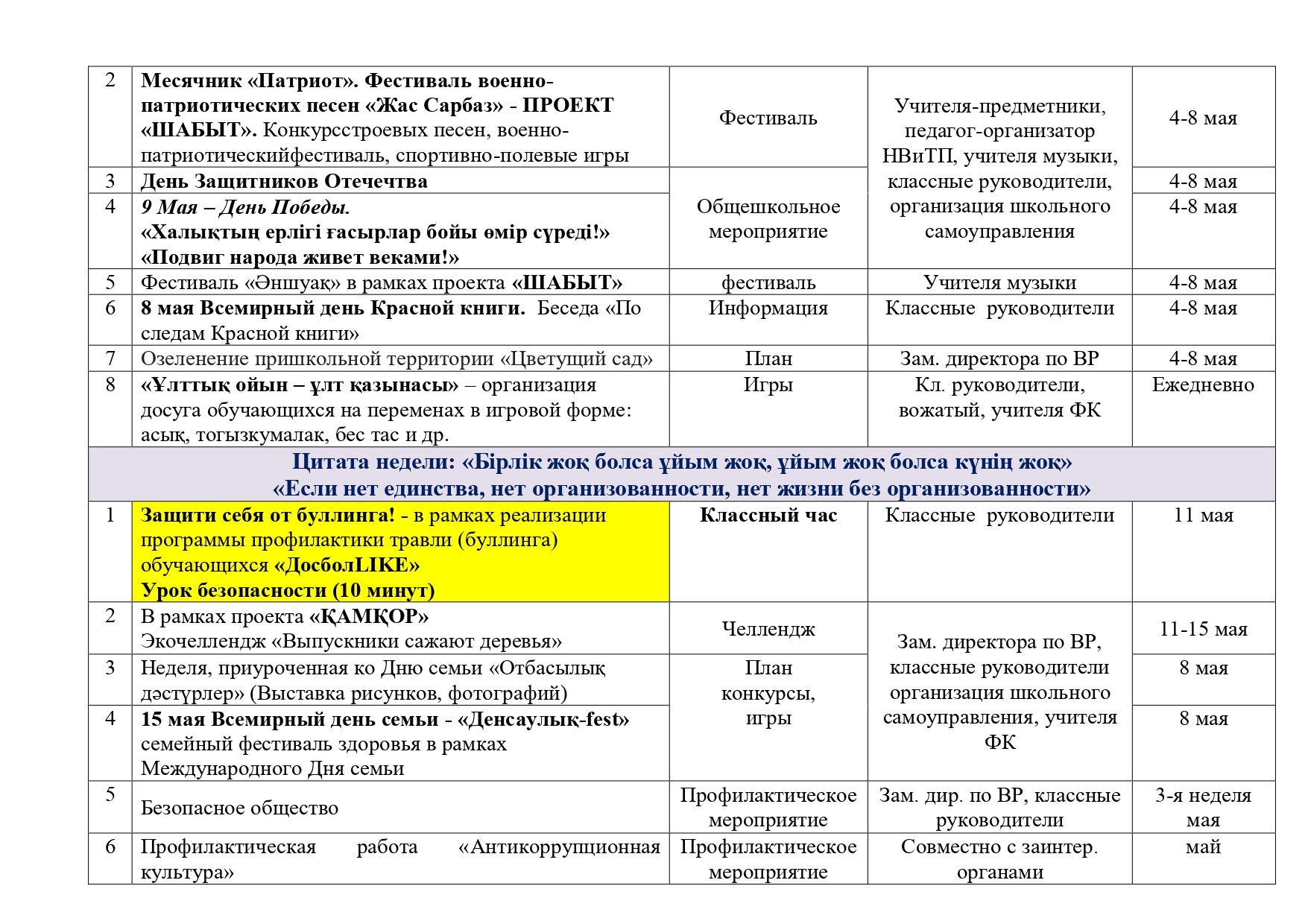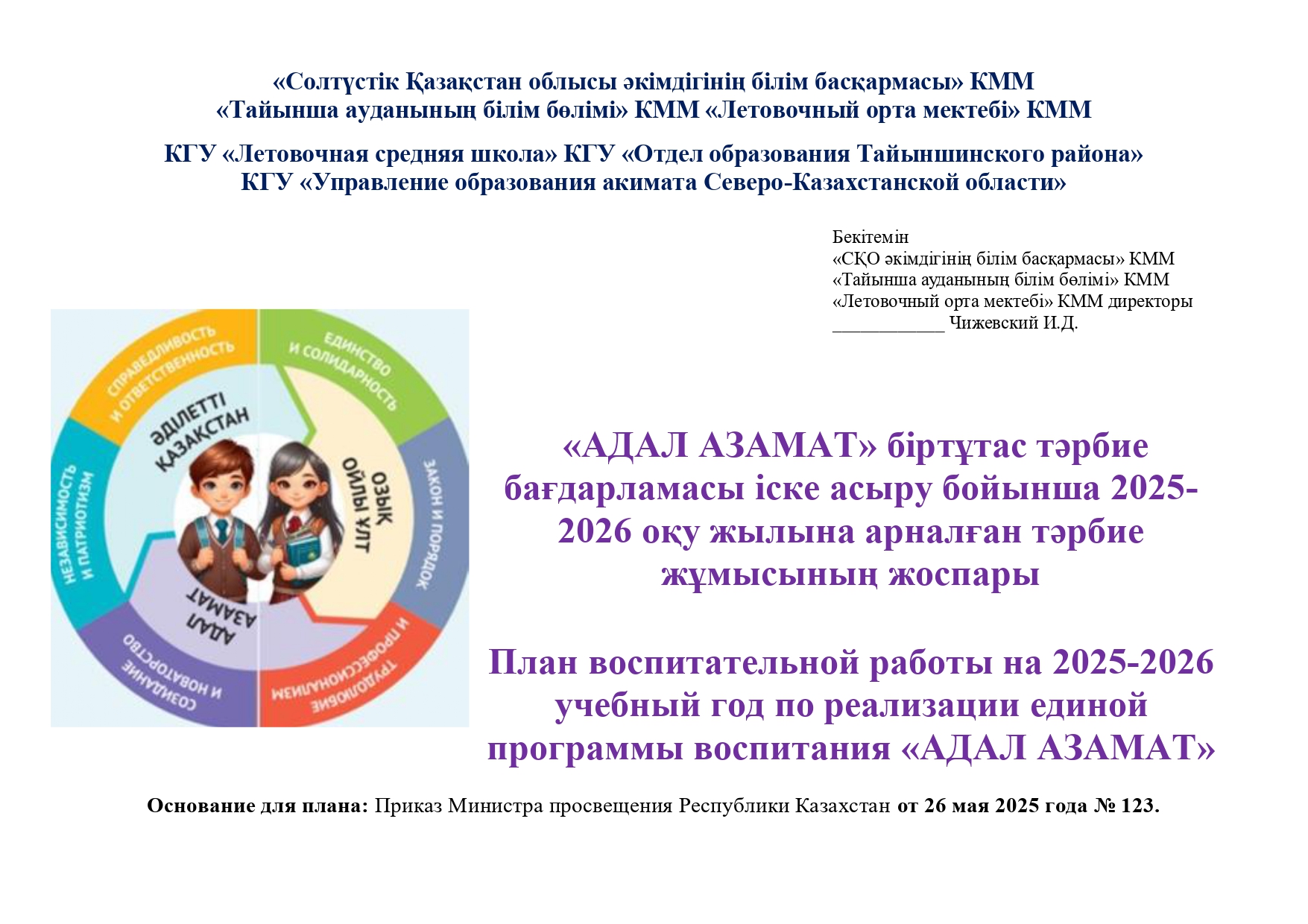 Воспитательный план — КГУ «Летовочная средняя школа» отдела образования Тайыншинского района