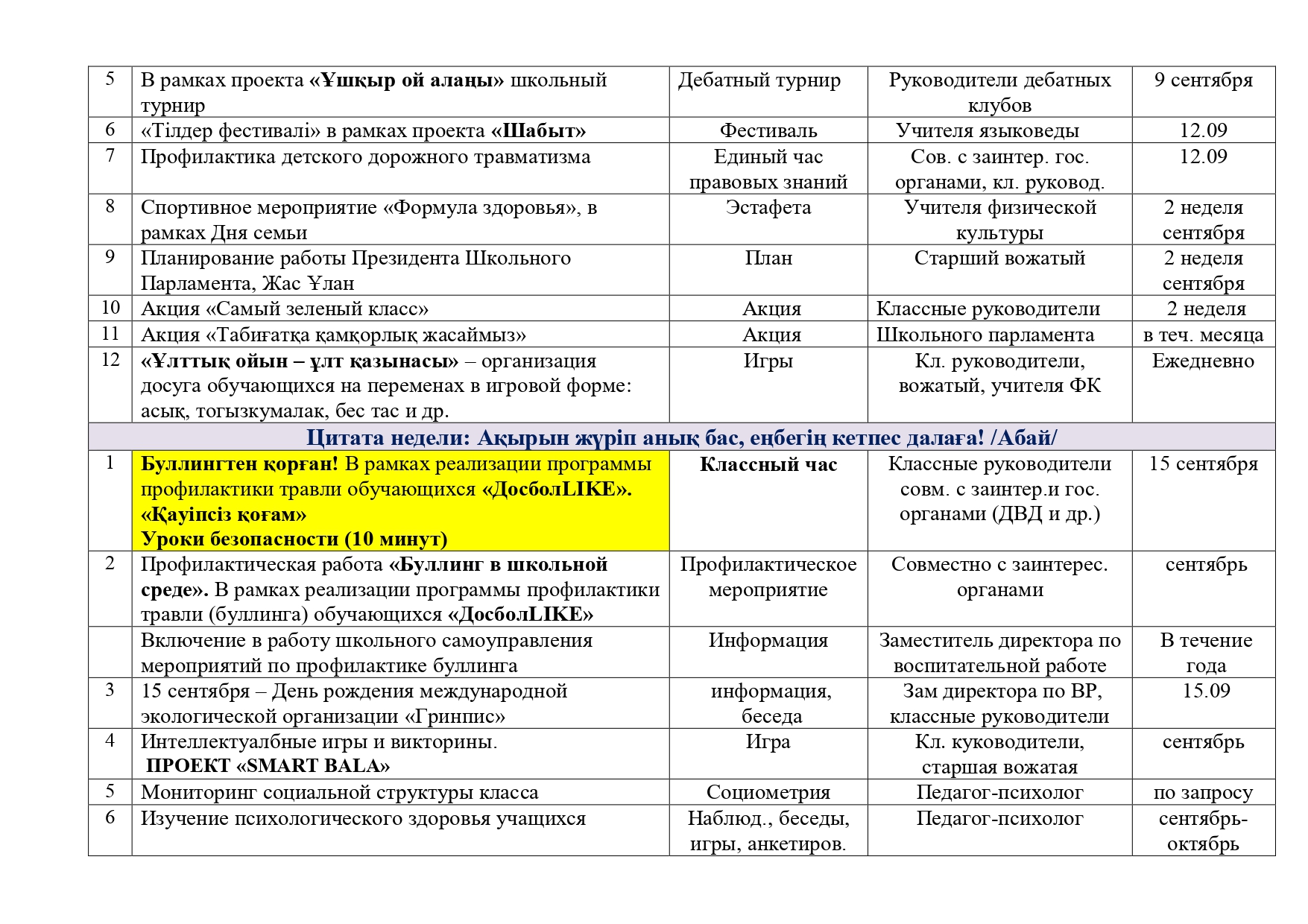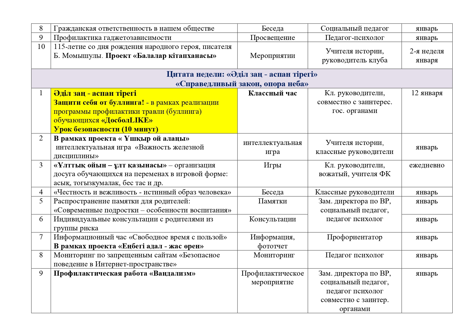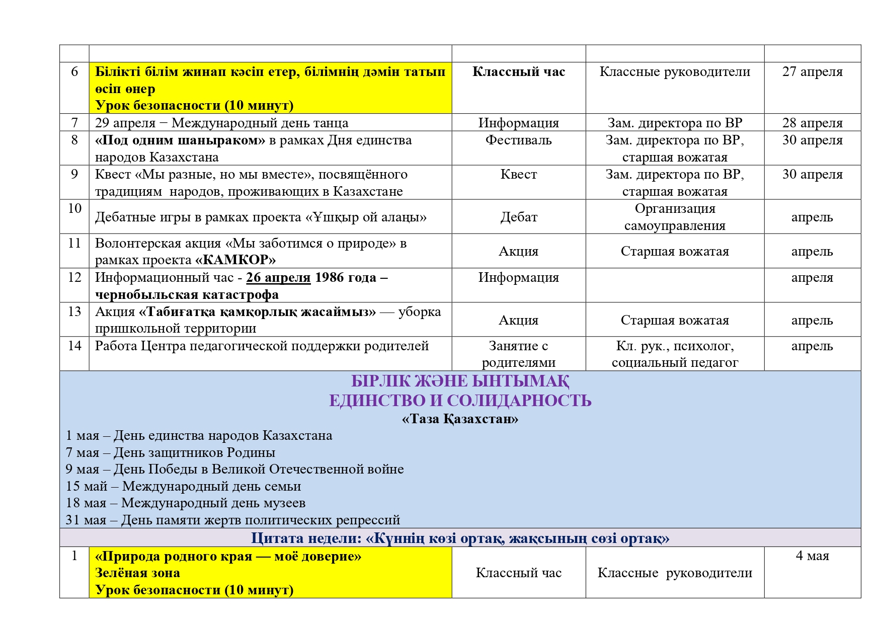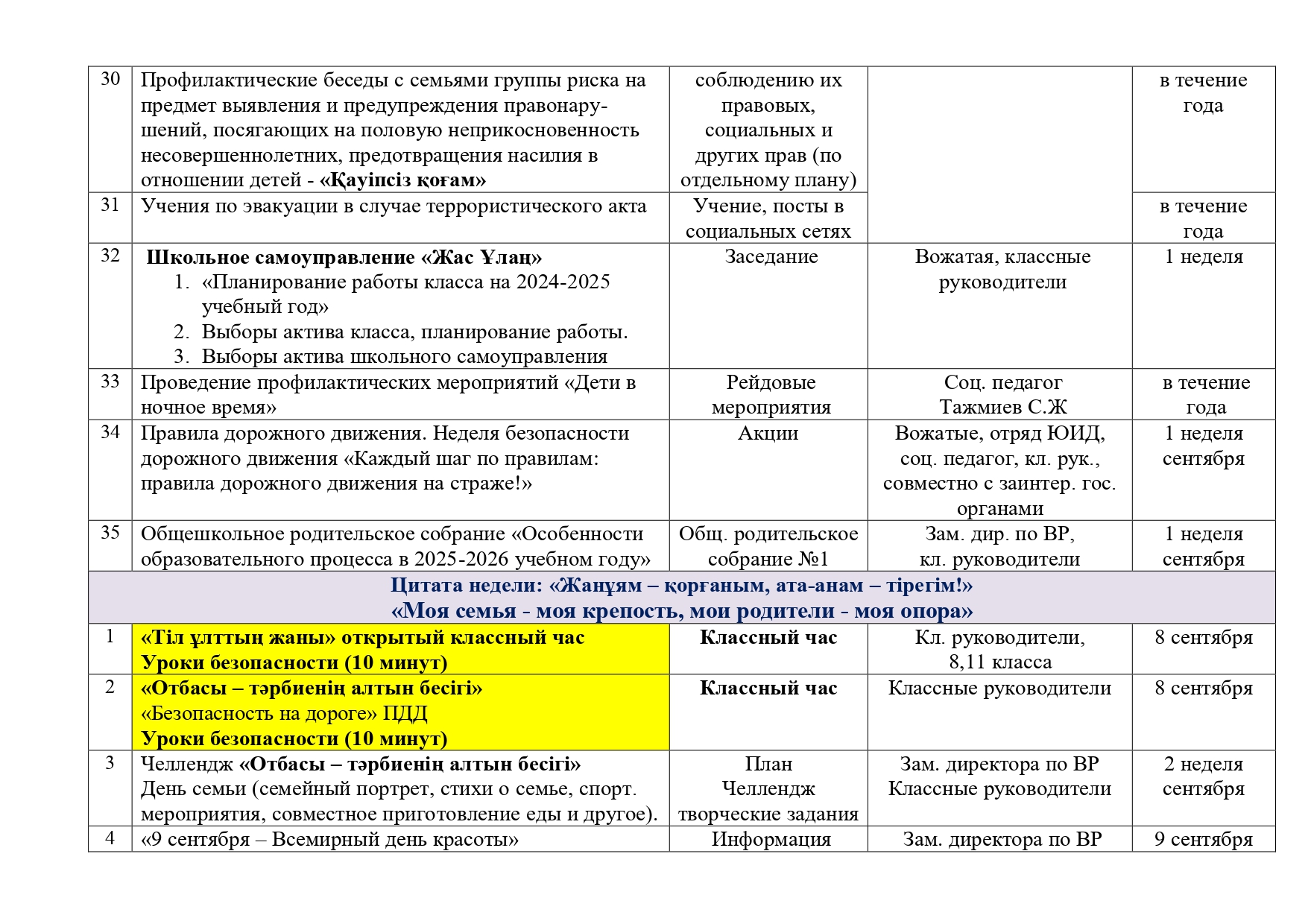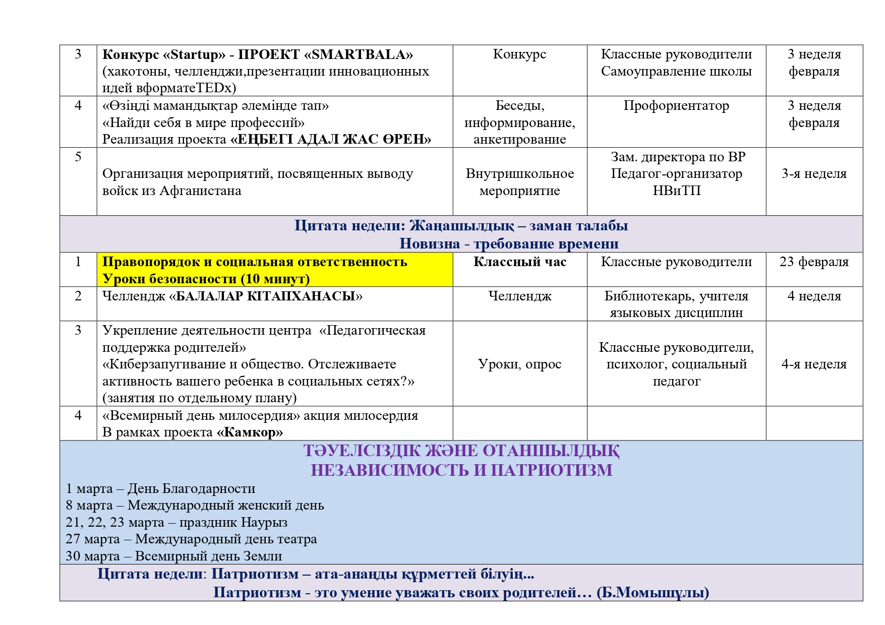 Воспитательный план — КГУ «Летовочная средняя школа» отдела образования Тайыншинского района