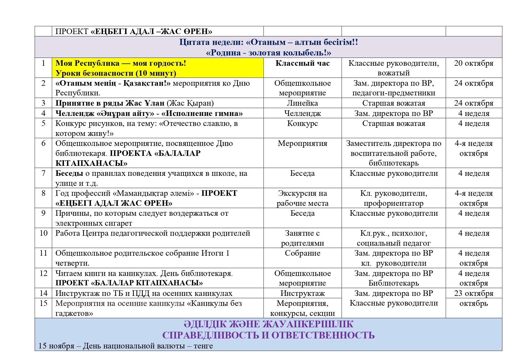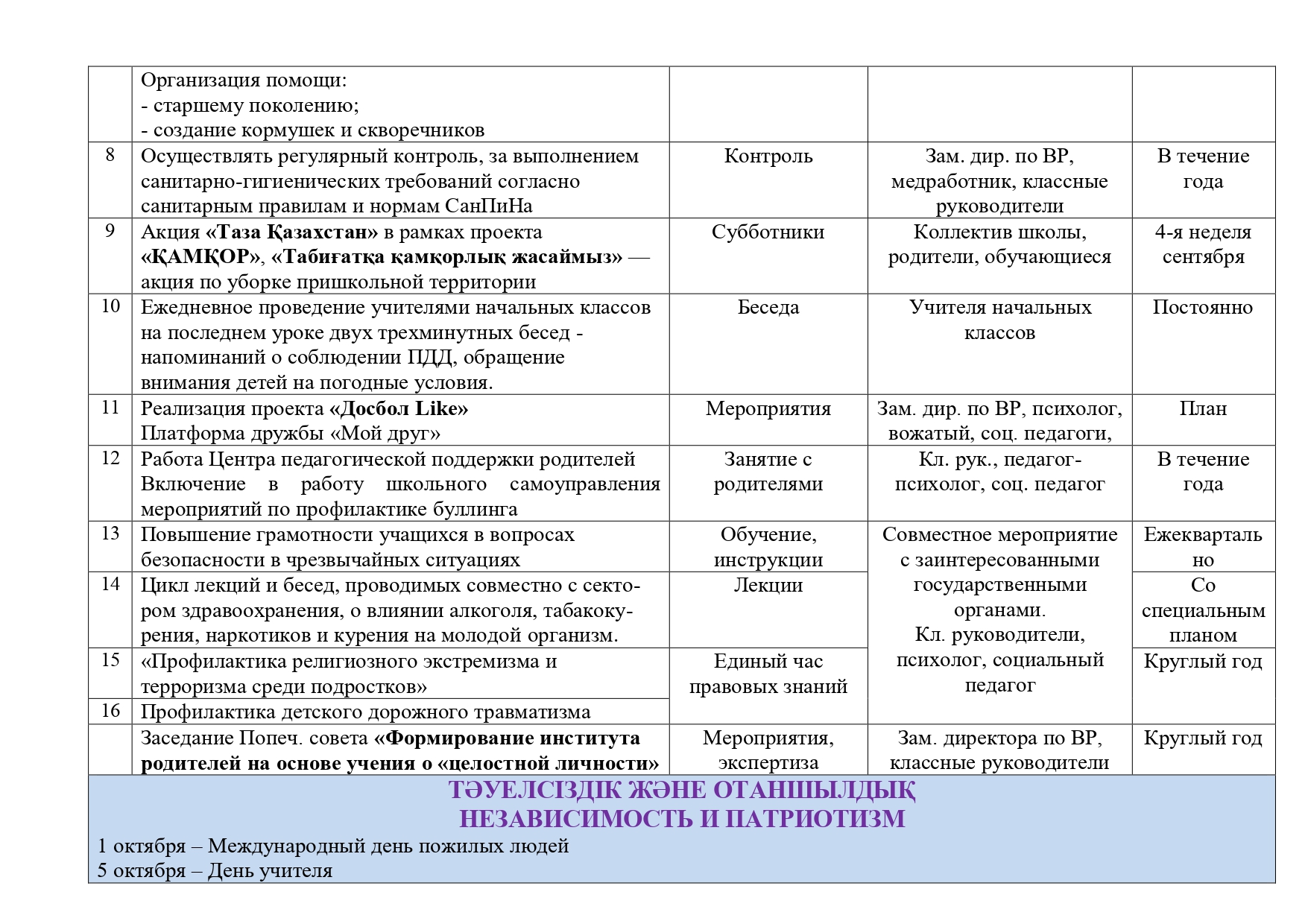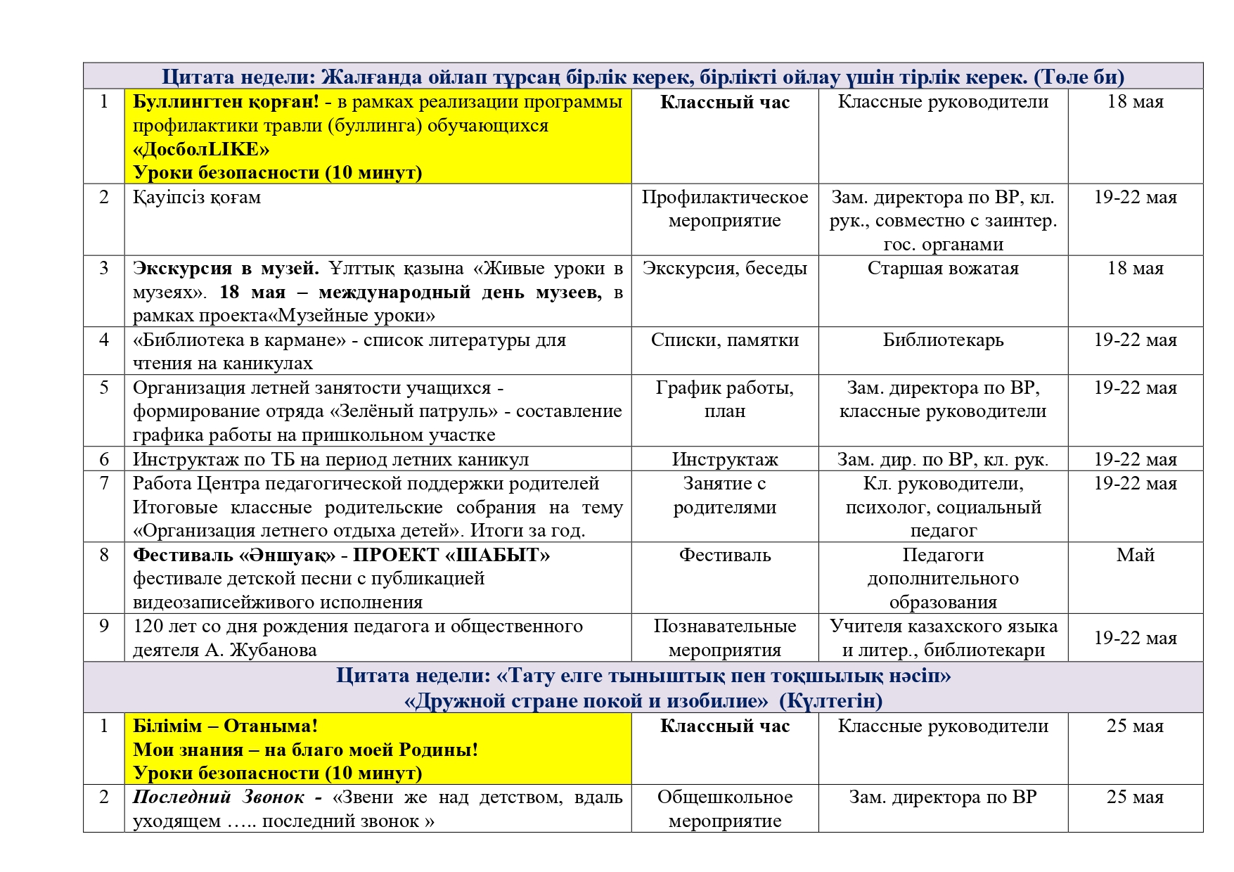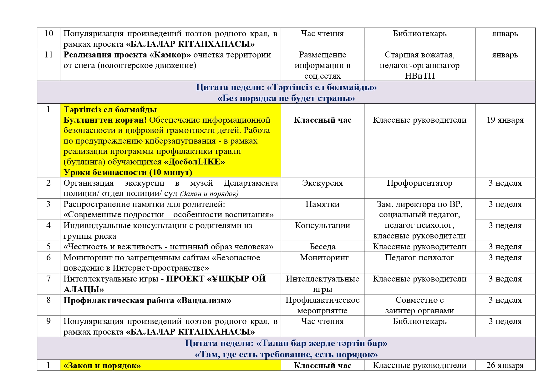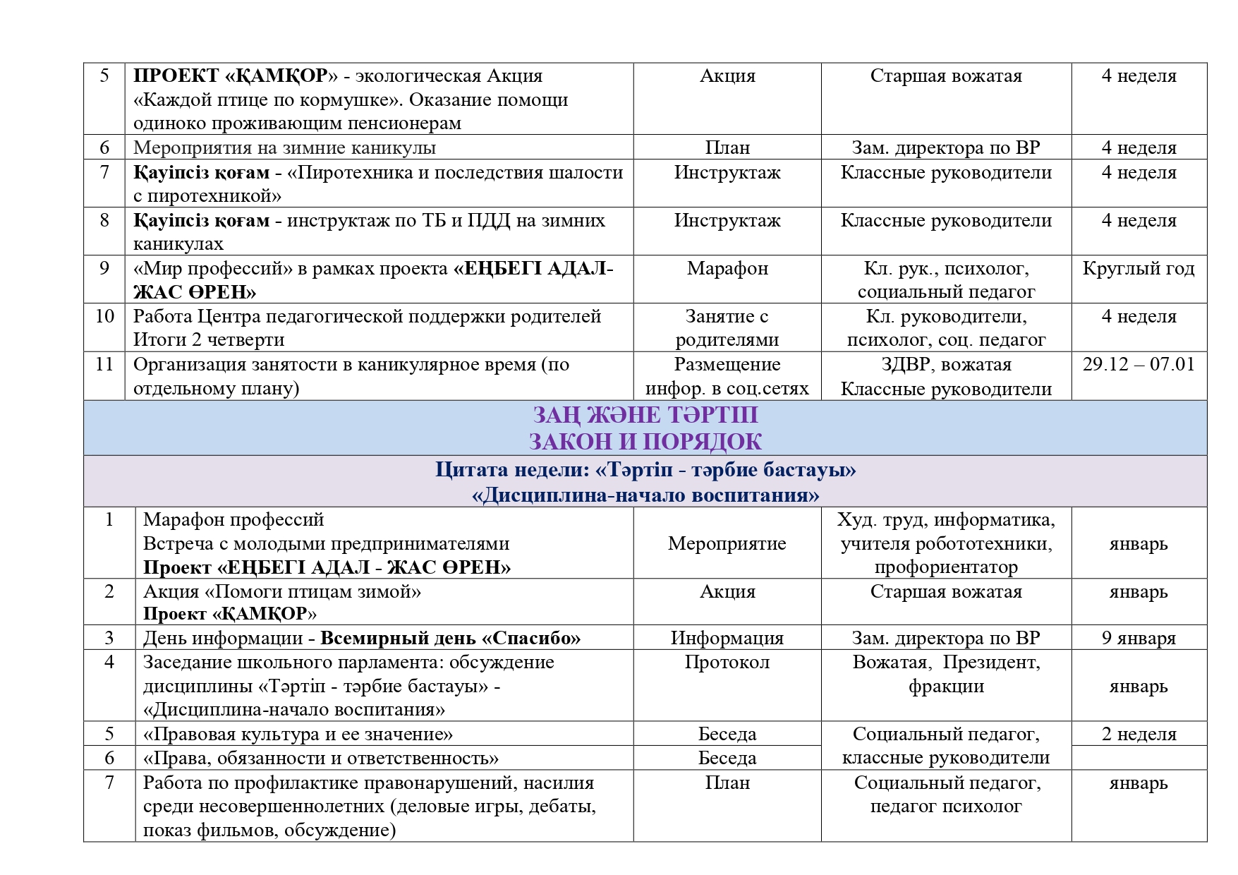 Воспитательный план — КГУ «Летовочная средняя школа» отдела образования Тайыншинского района
