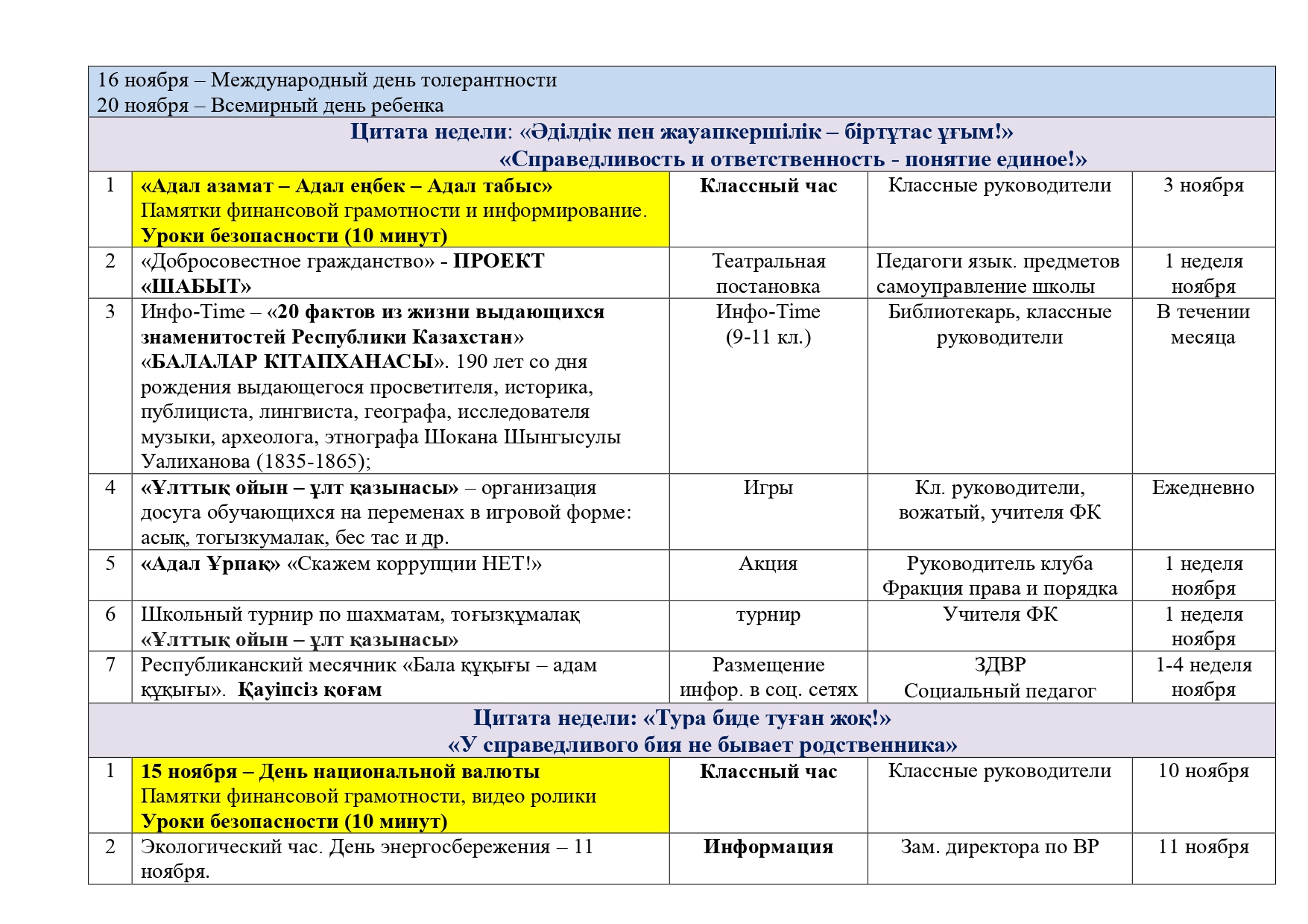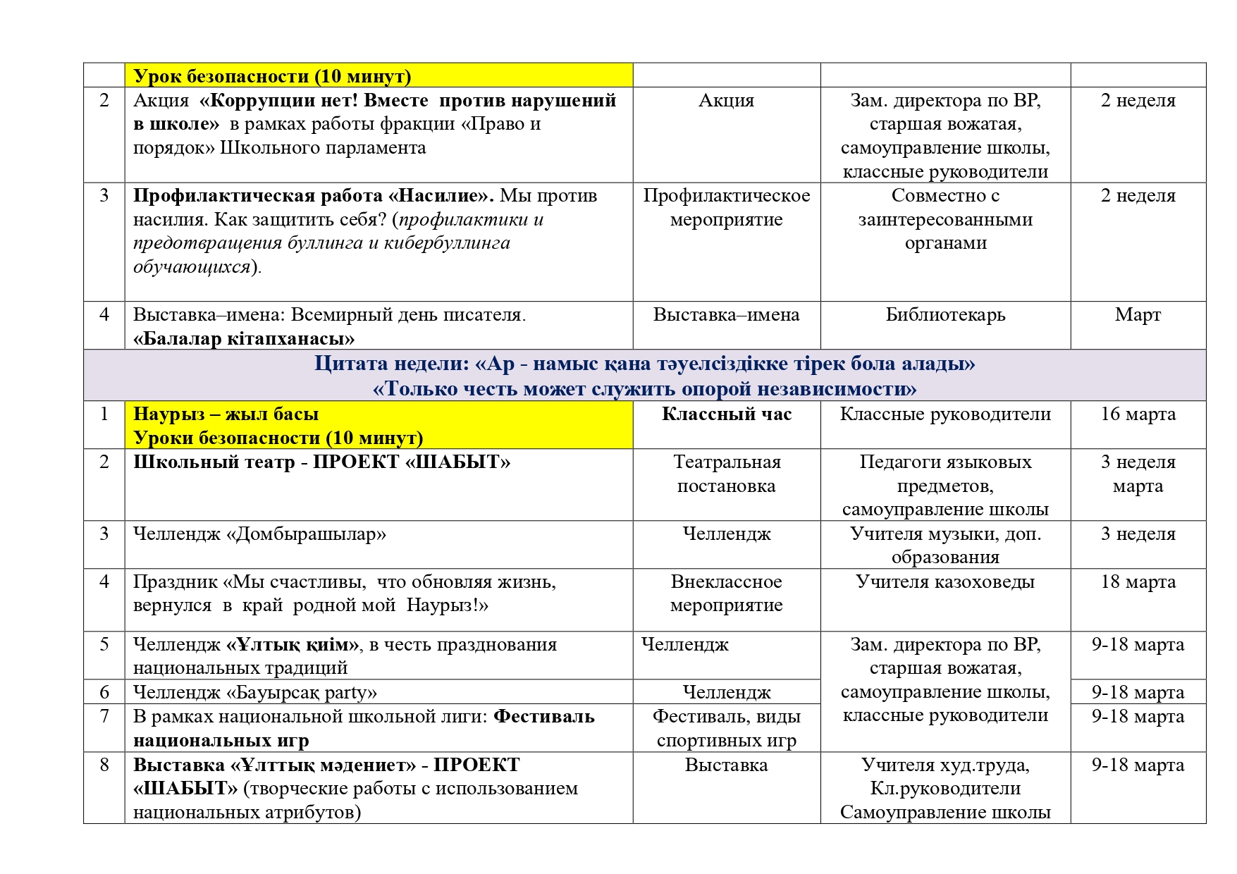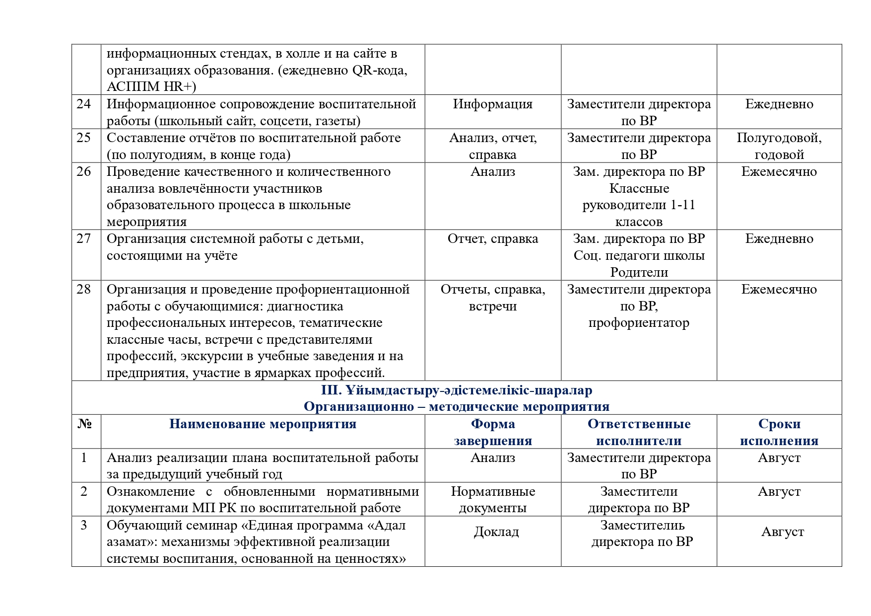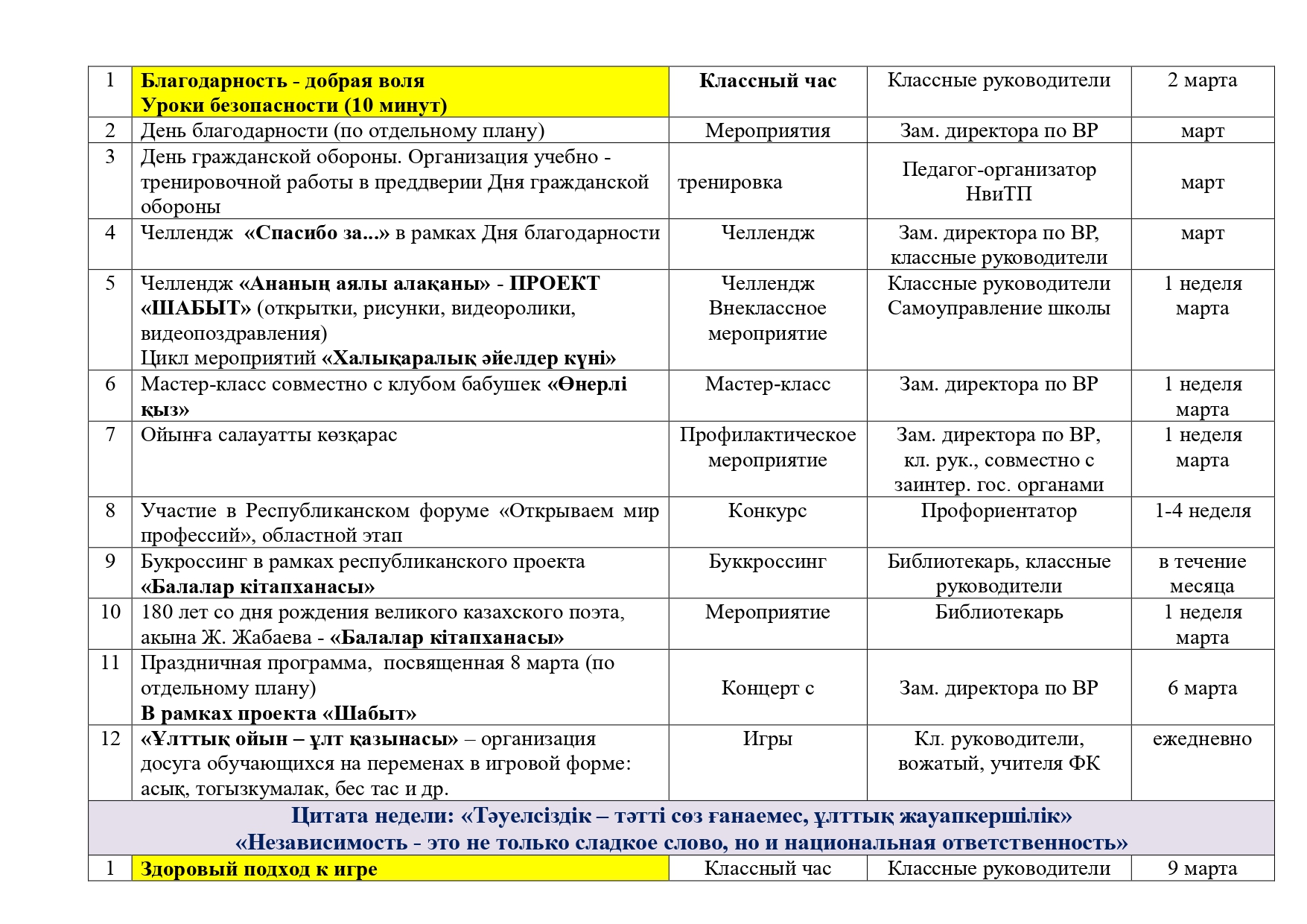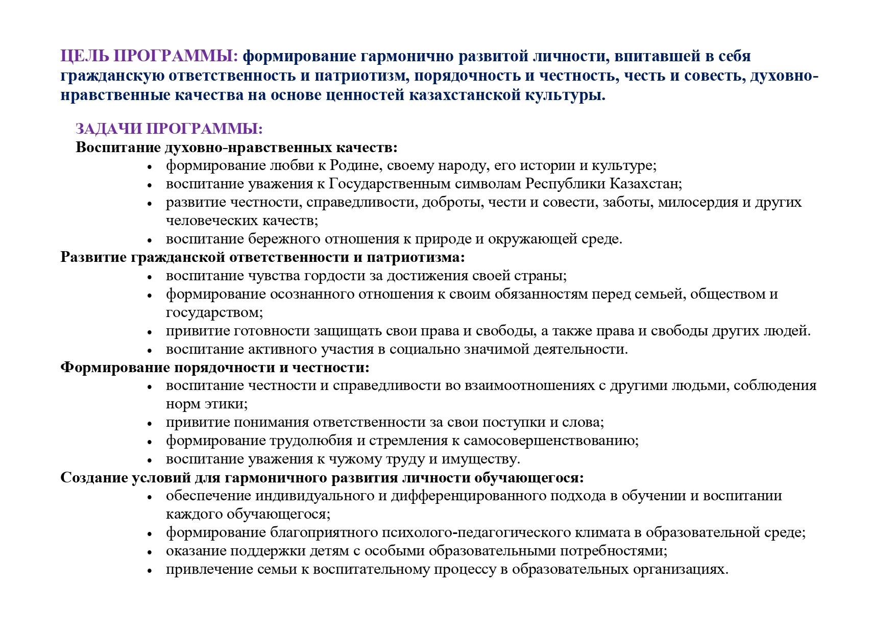 Воспитательный план — КГУ «Летовочная средняя школа» отдела образования Тайыншинского района
