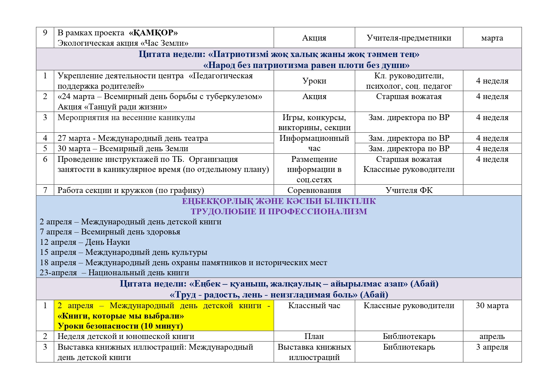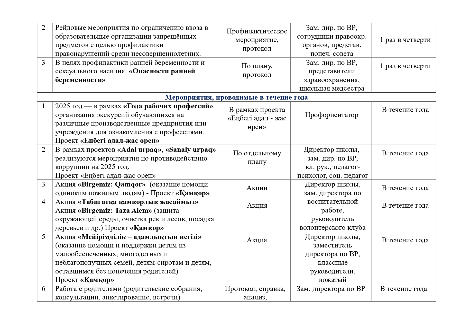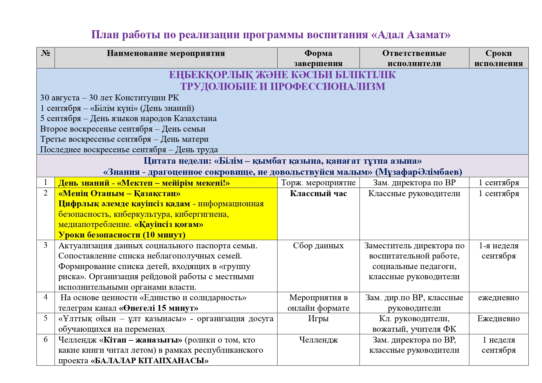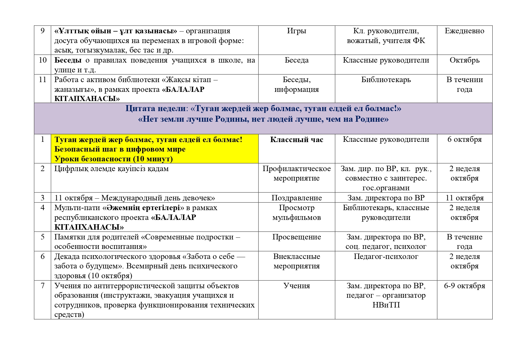 Воспитательный план — КГУ «Летовочная средняя школа» отдела образования Тайыншинского района