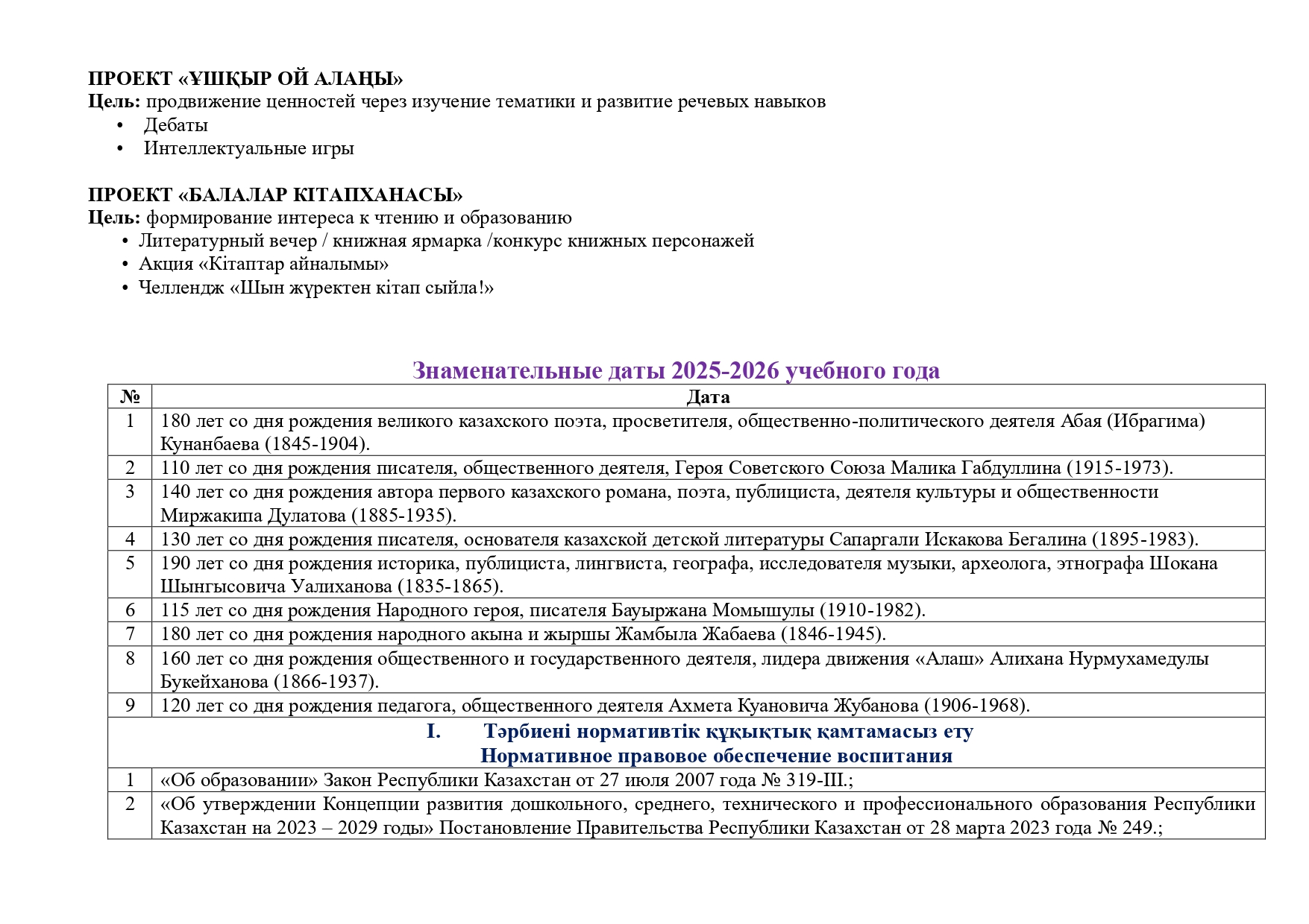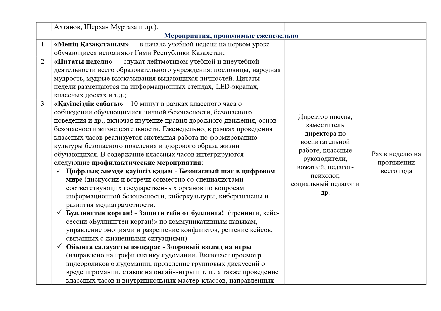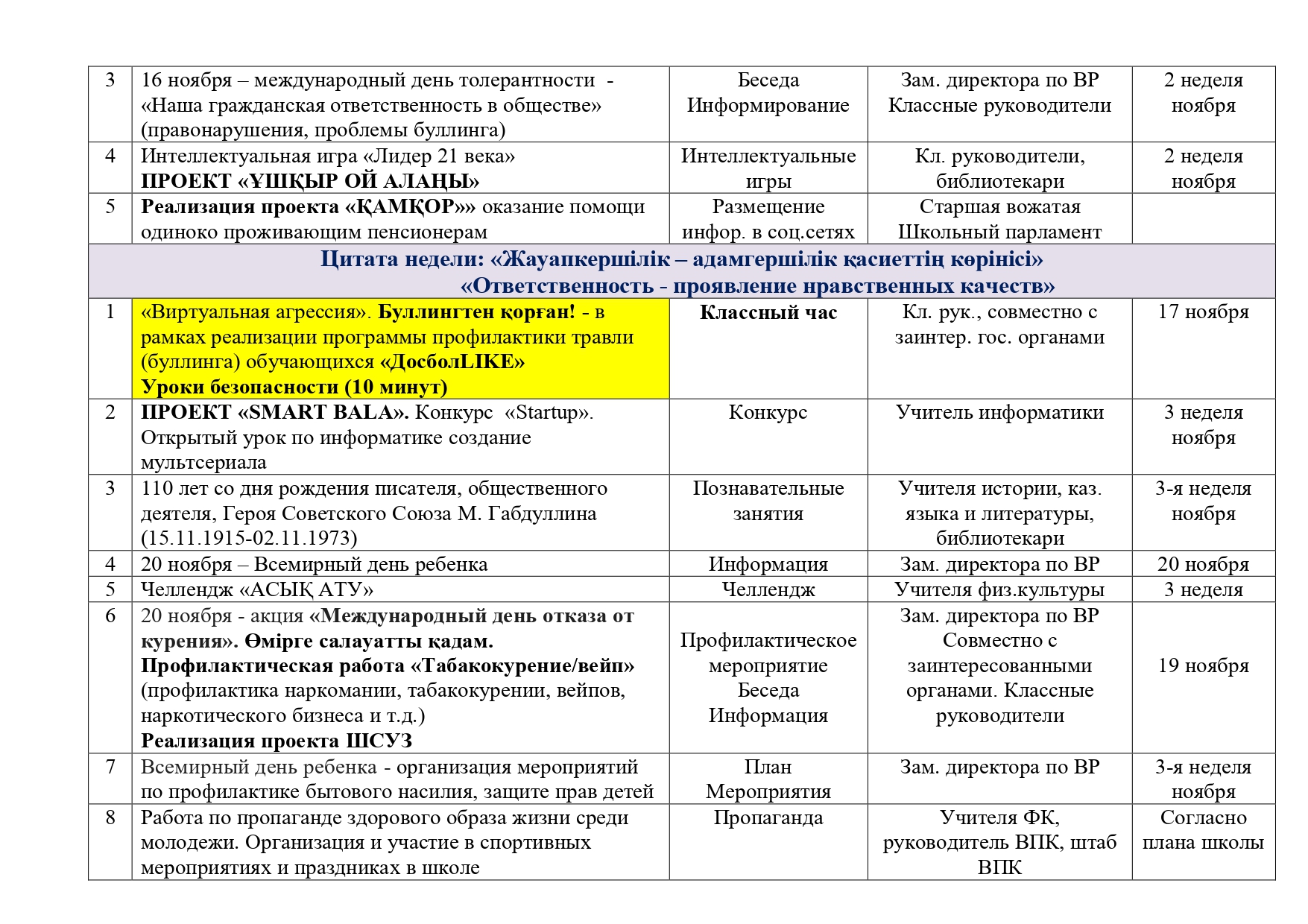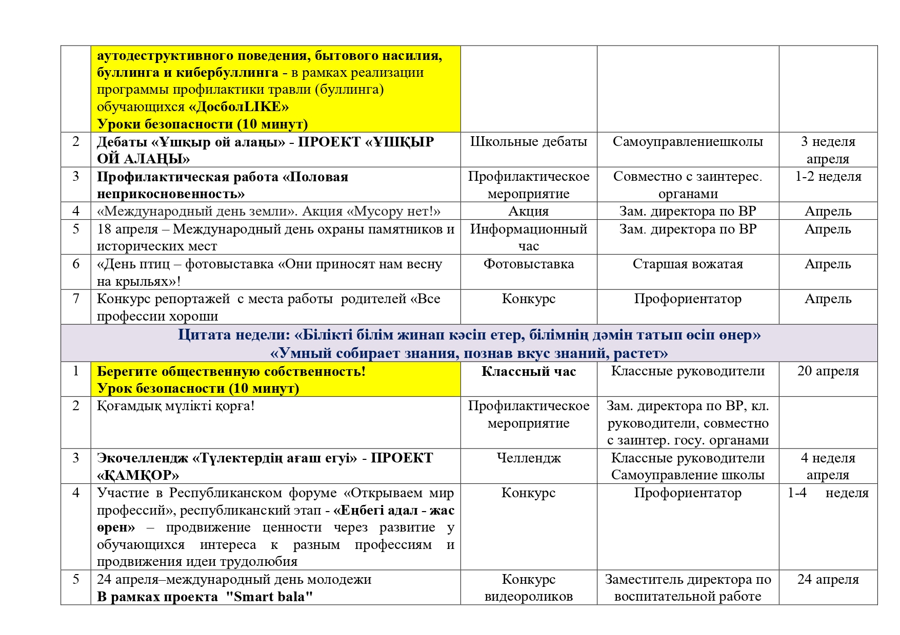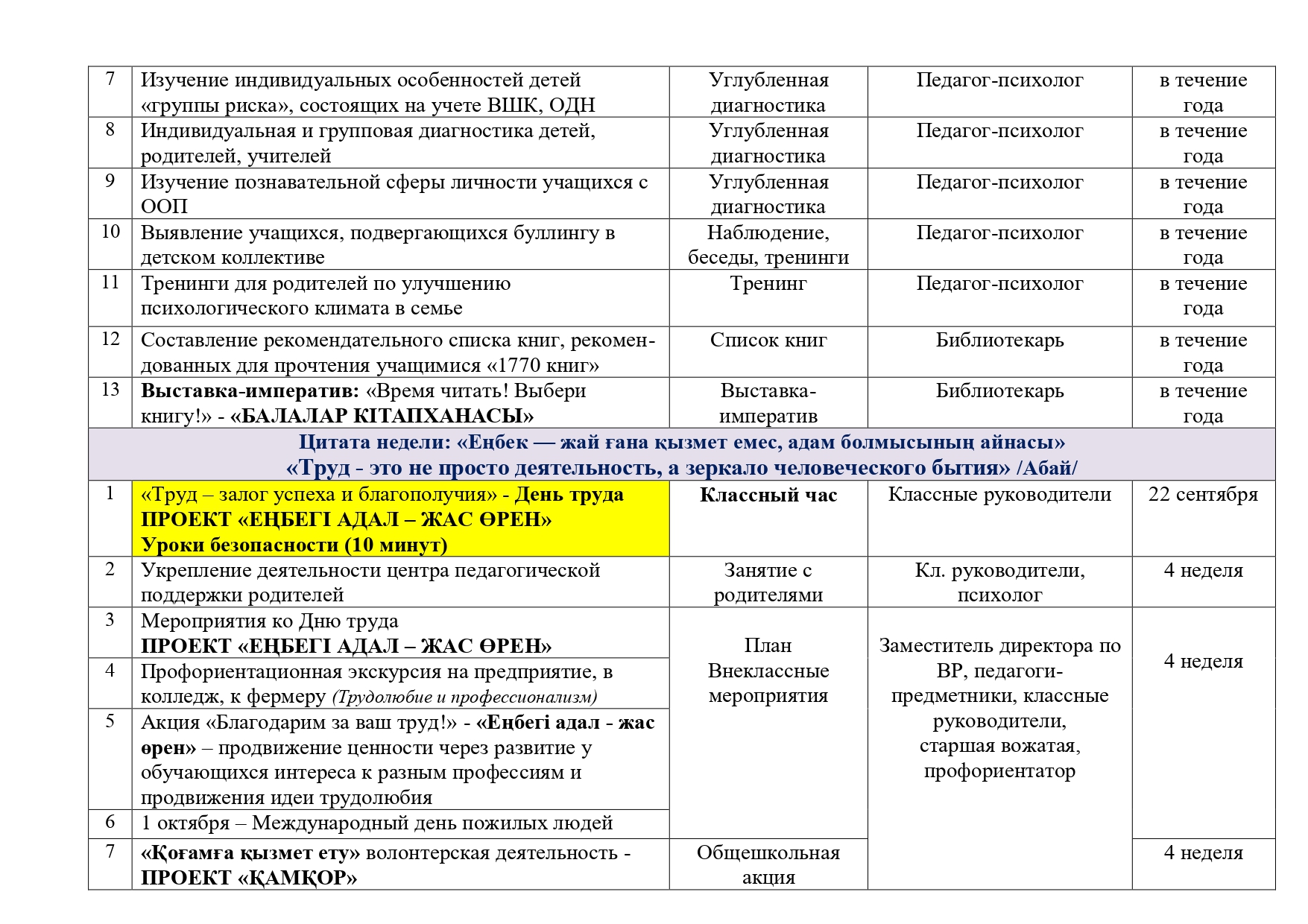 Воспитательный план — КГУ «Летовочная средняя школа» отдела образования Тайыншинского района