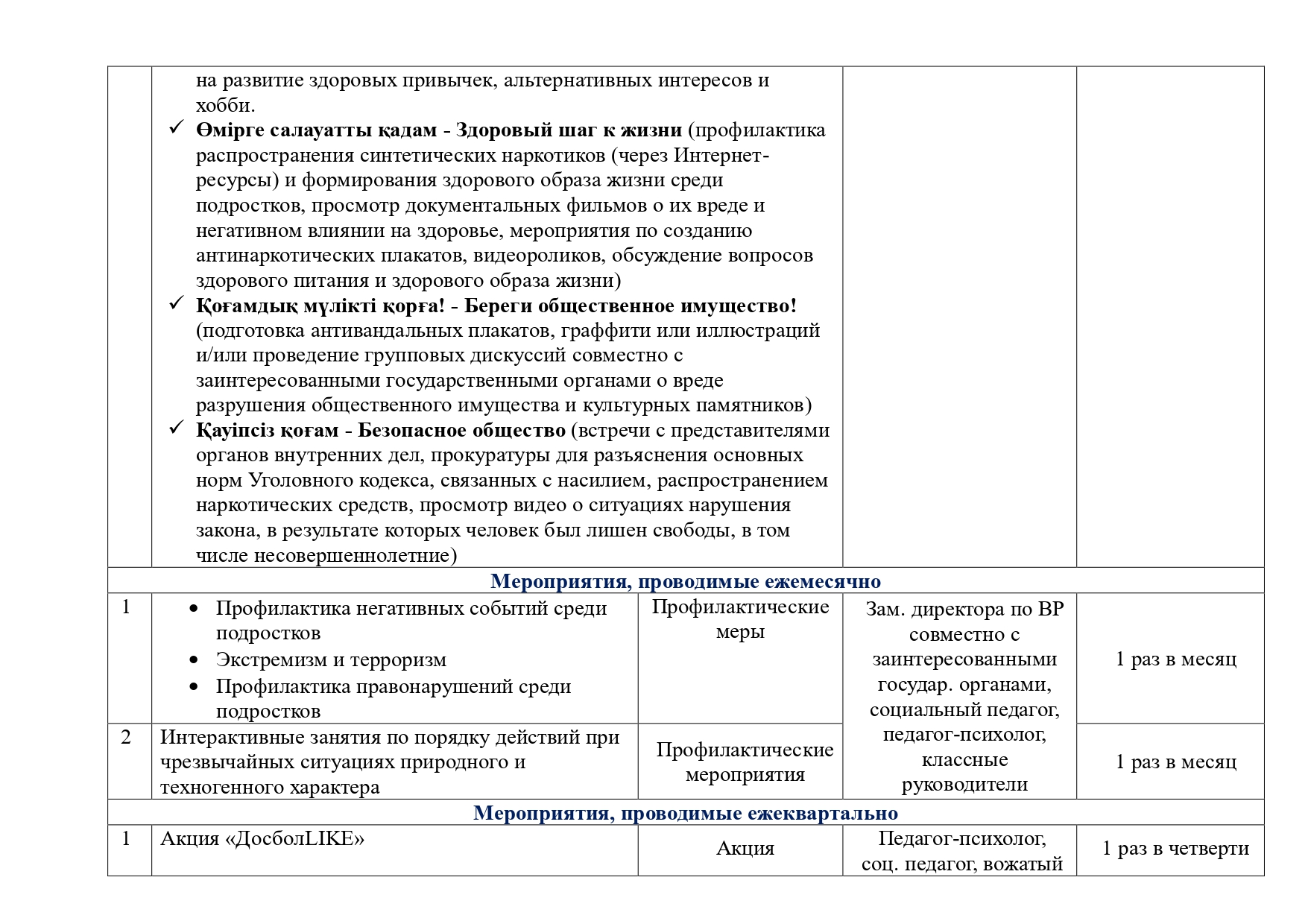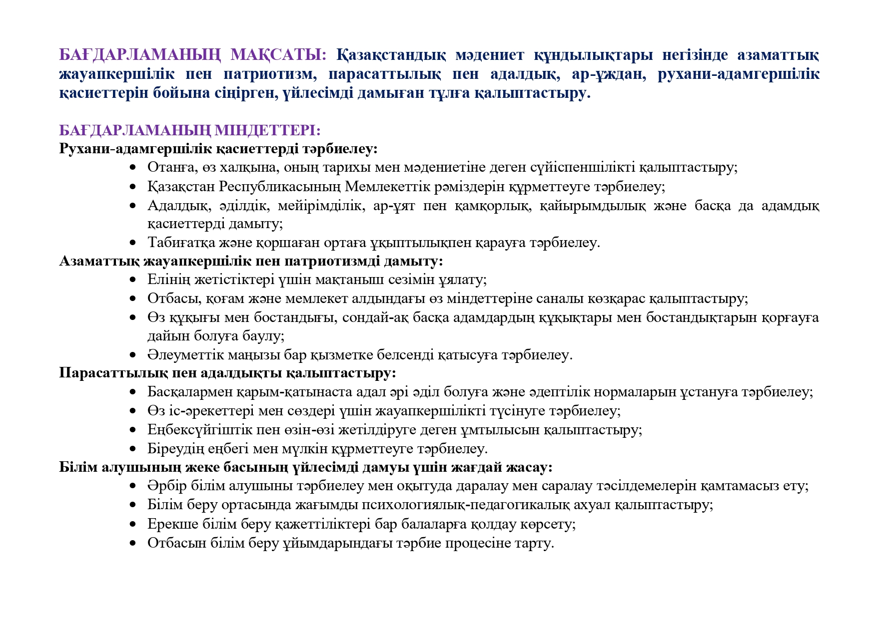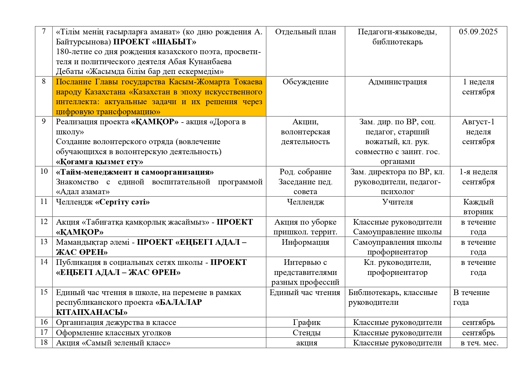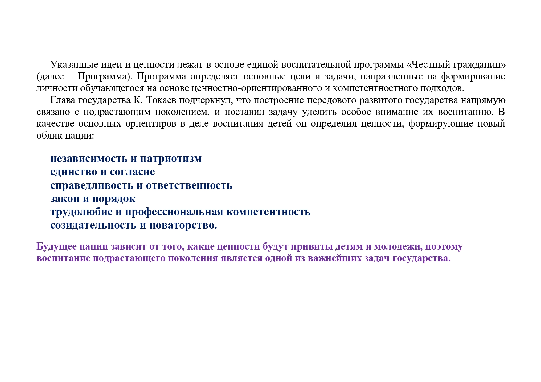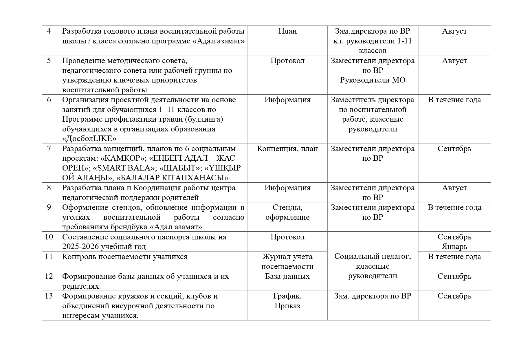 Воспитательный план — КГУ «Летовочная средняя школа» отдела образования Тайыншинского района