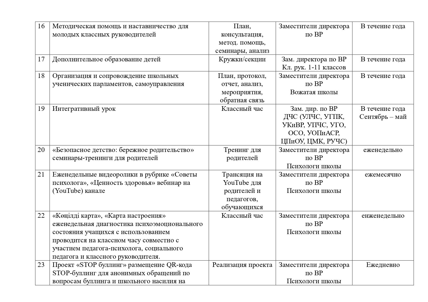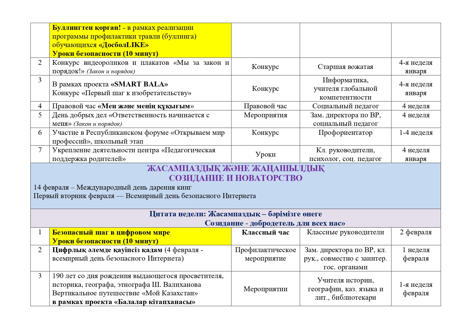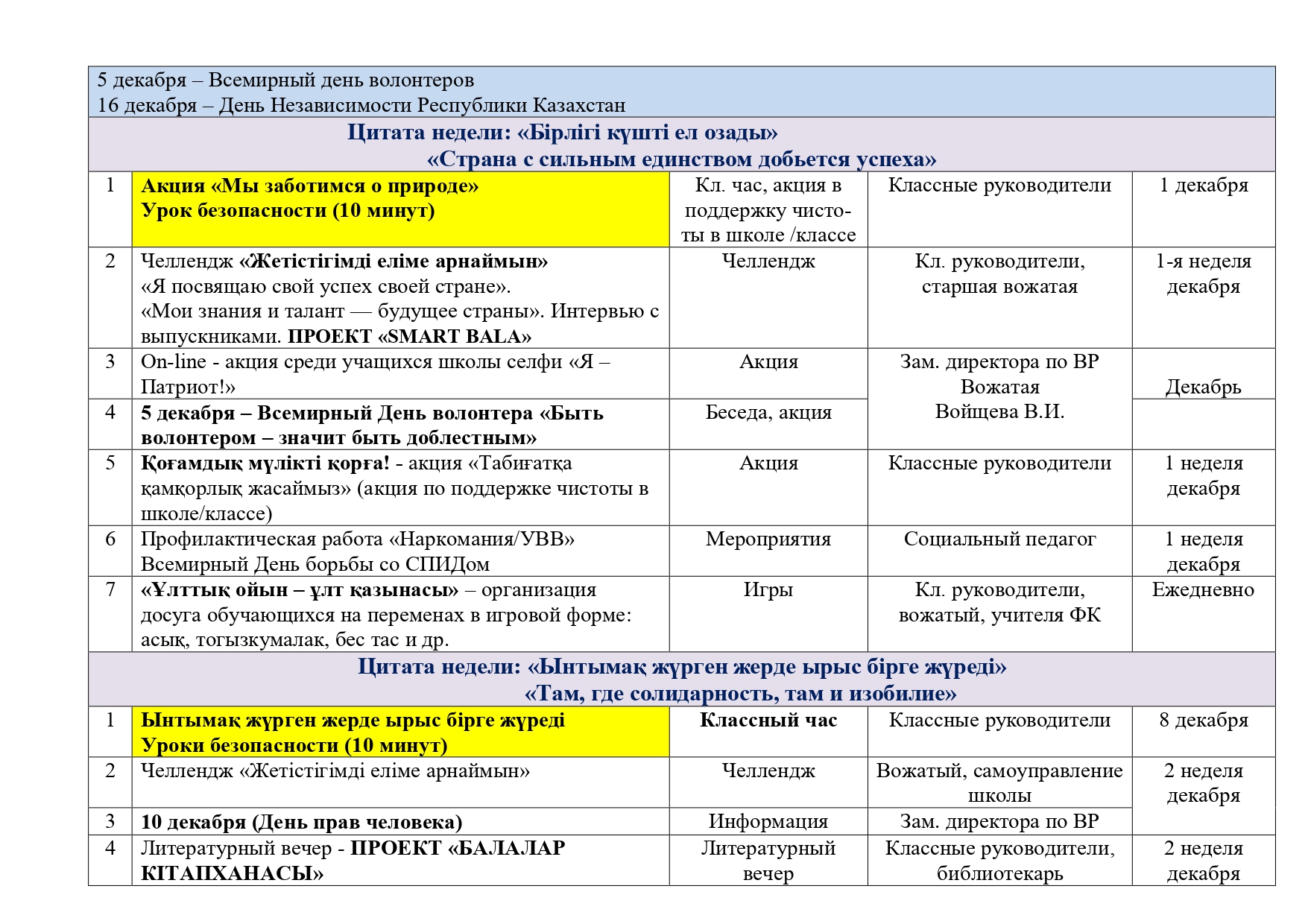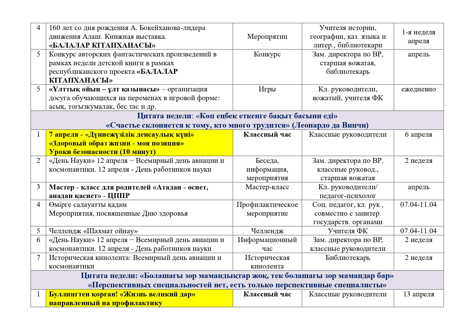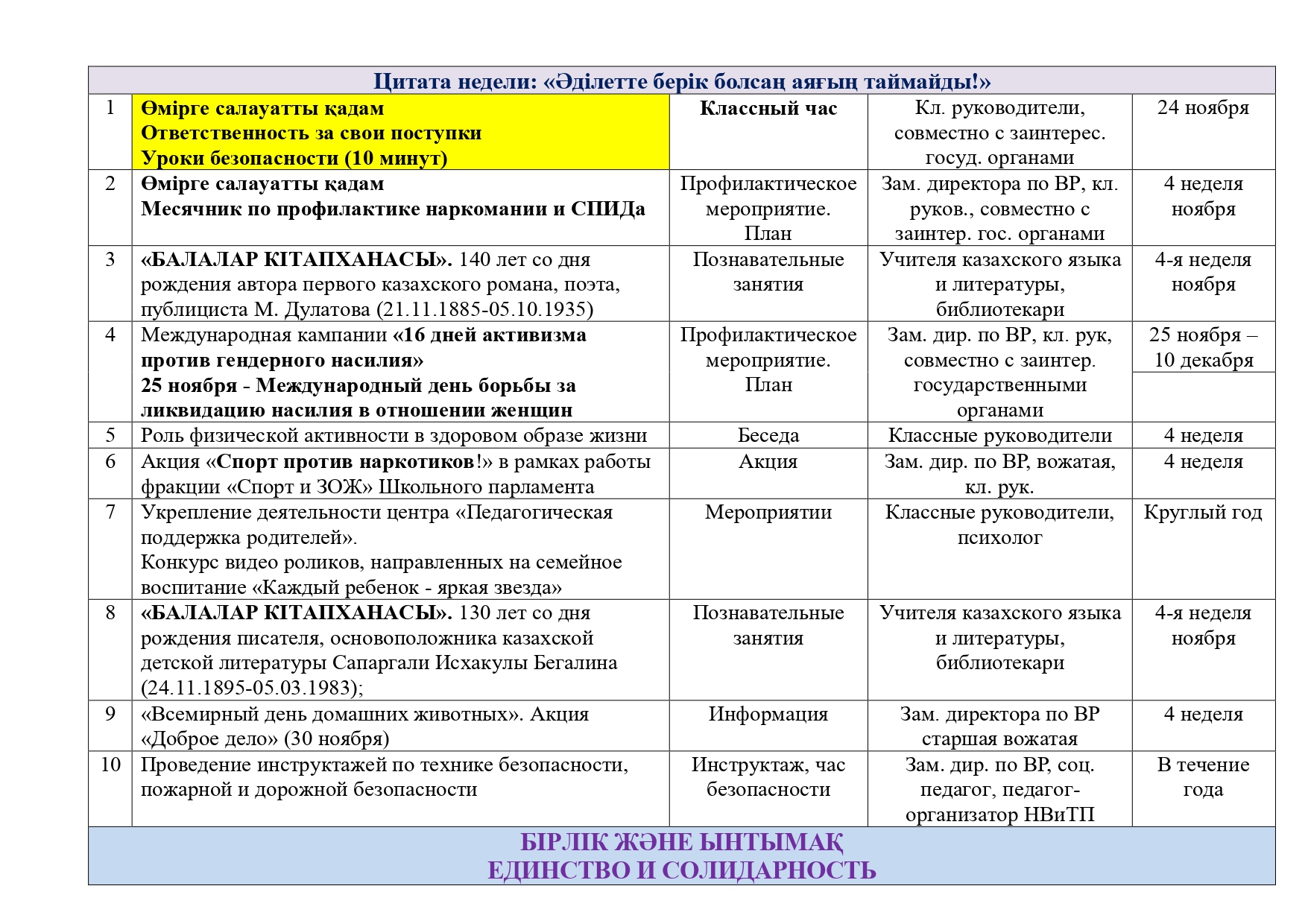 Воспитательный план — КГУ «Летовочная средняя школа» отдела образования Тайыншинского района