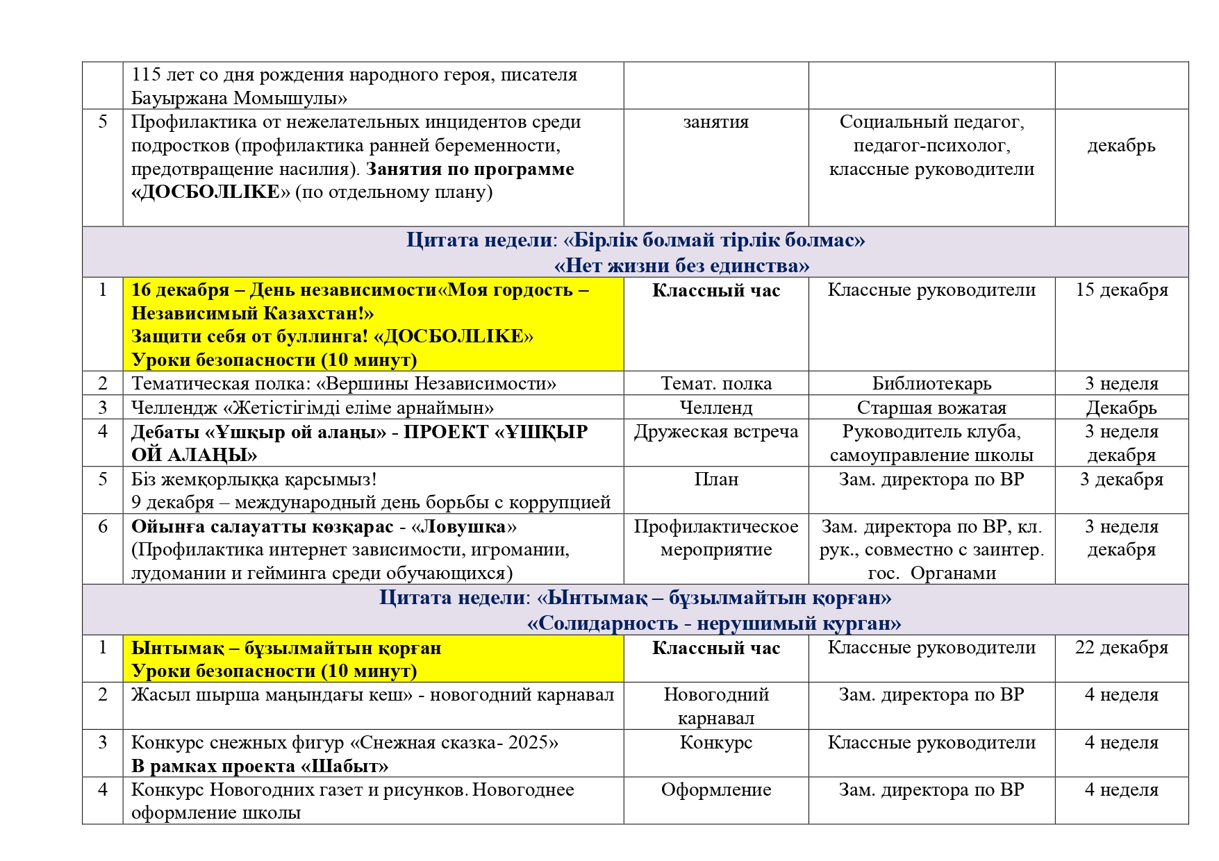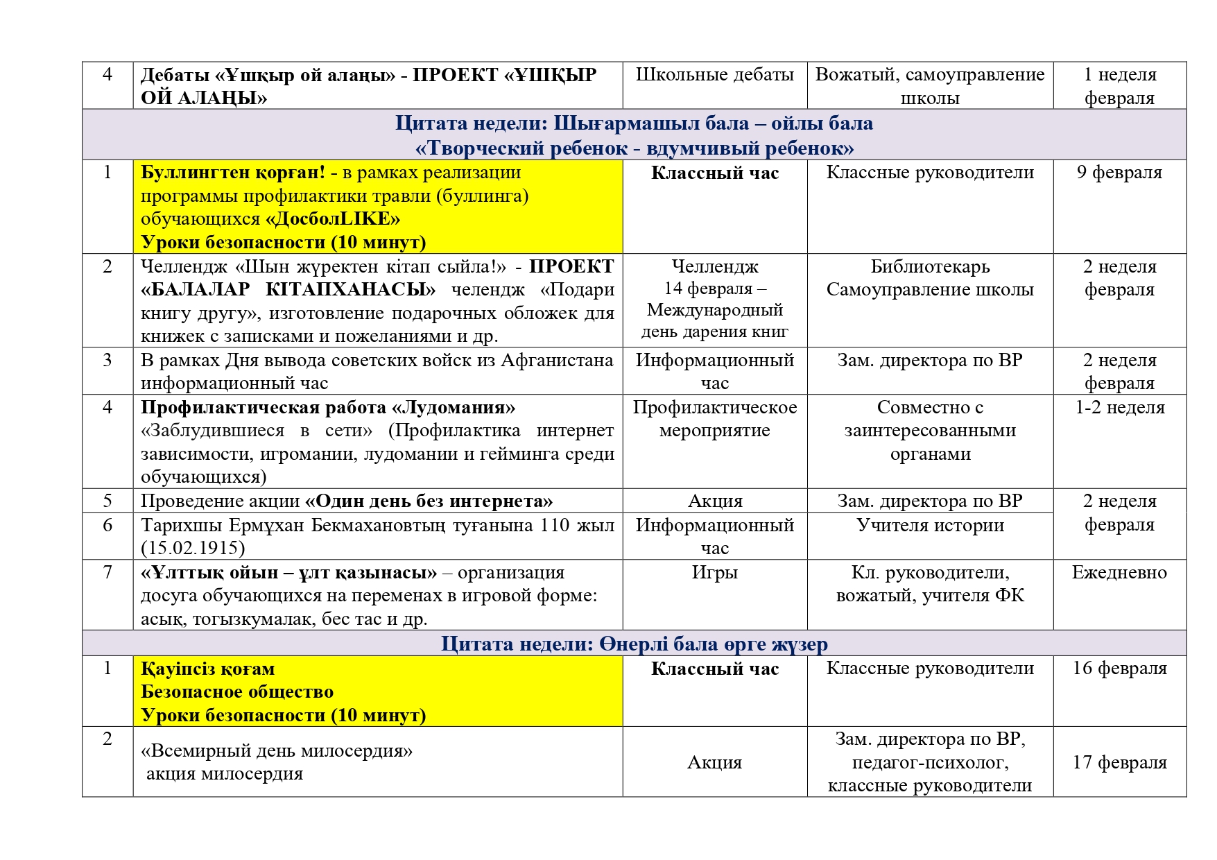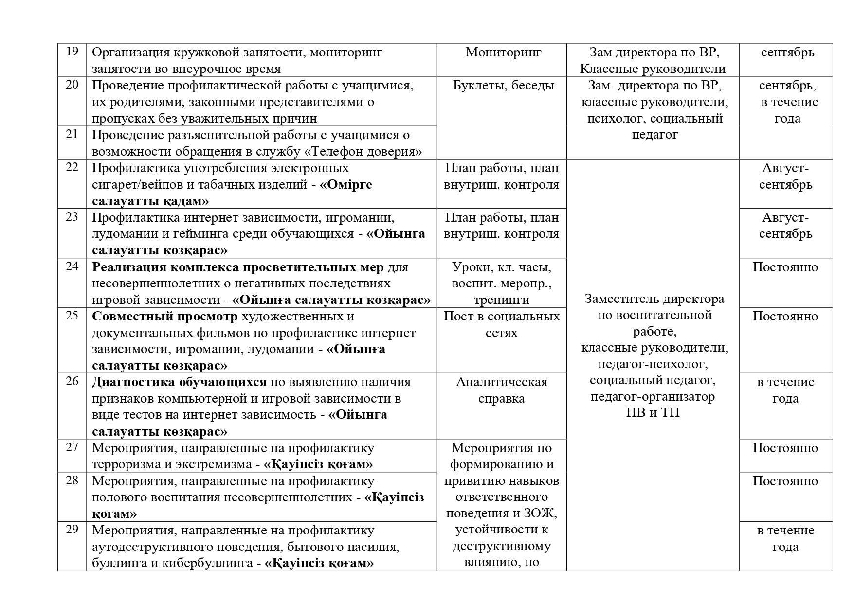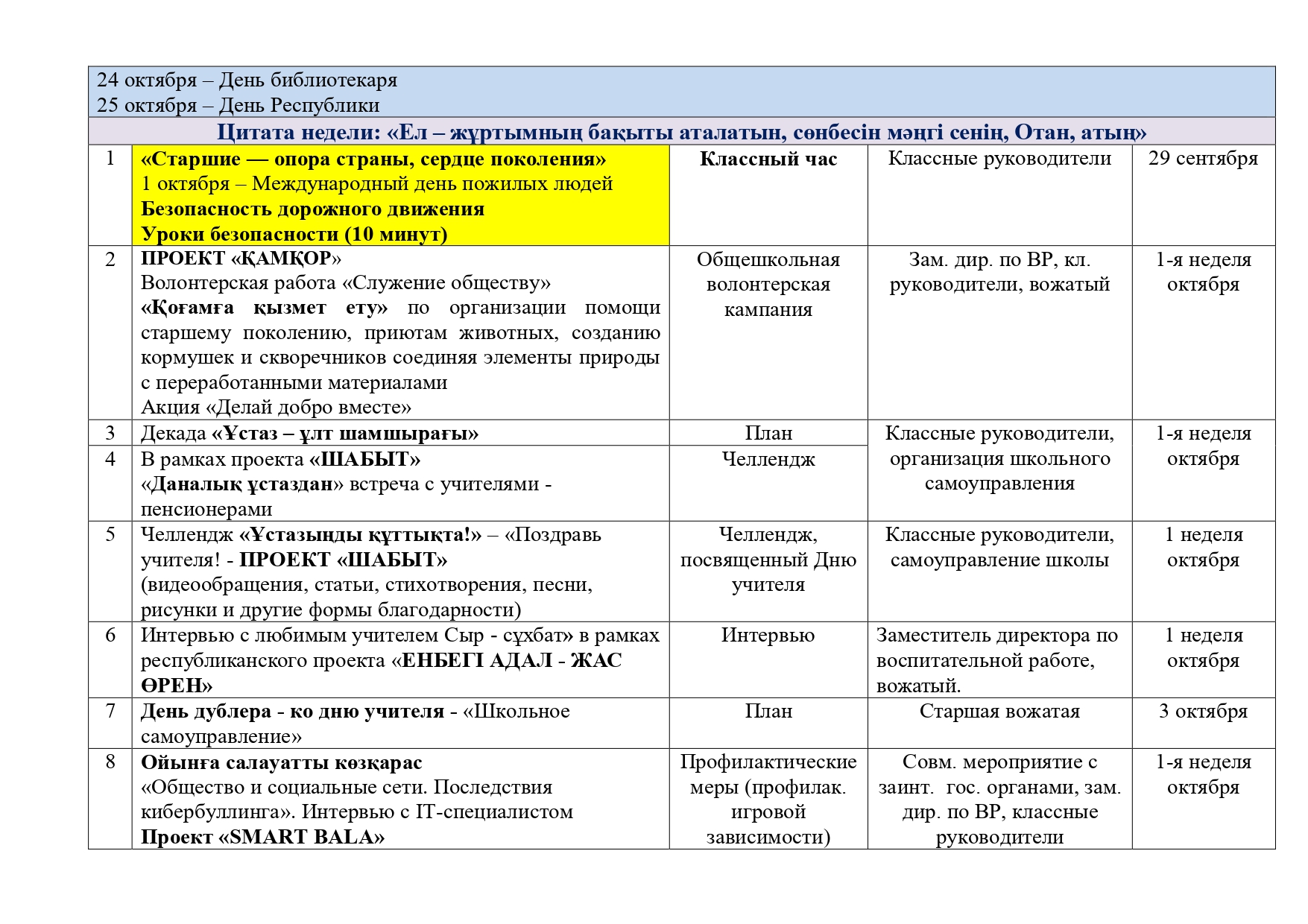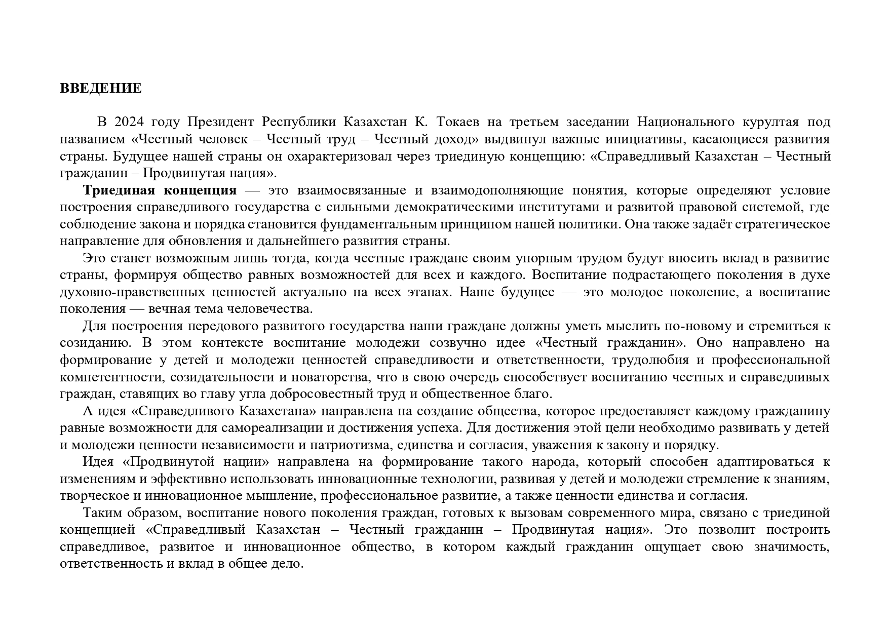 Воспитательный план — КГУ «Летовочная средняя школа» отдела образования Тайыншинского района